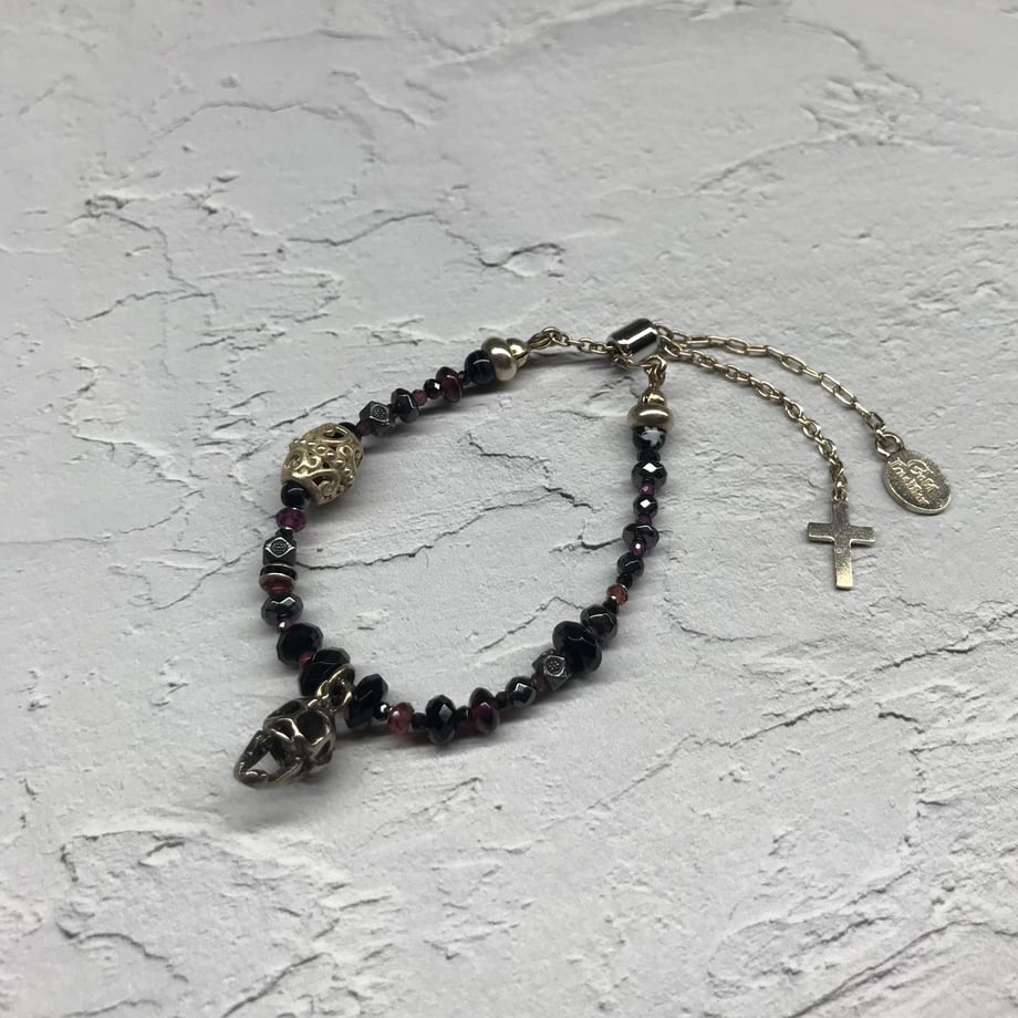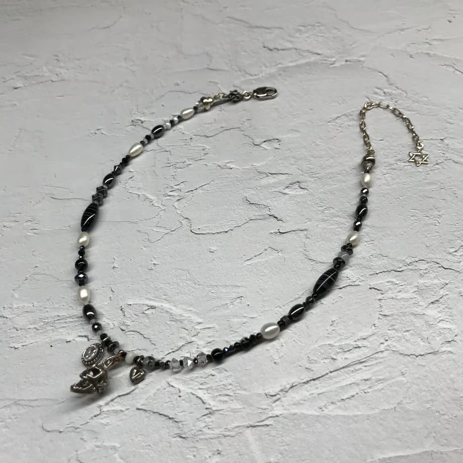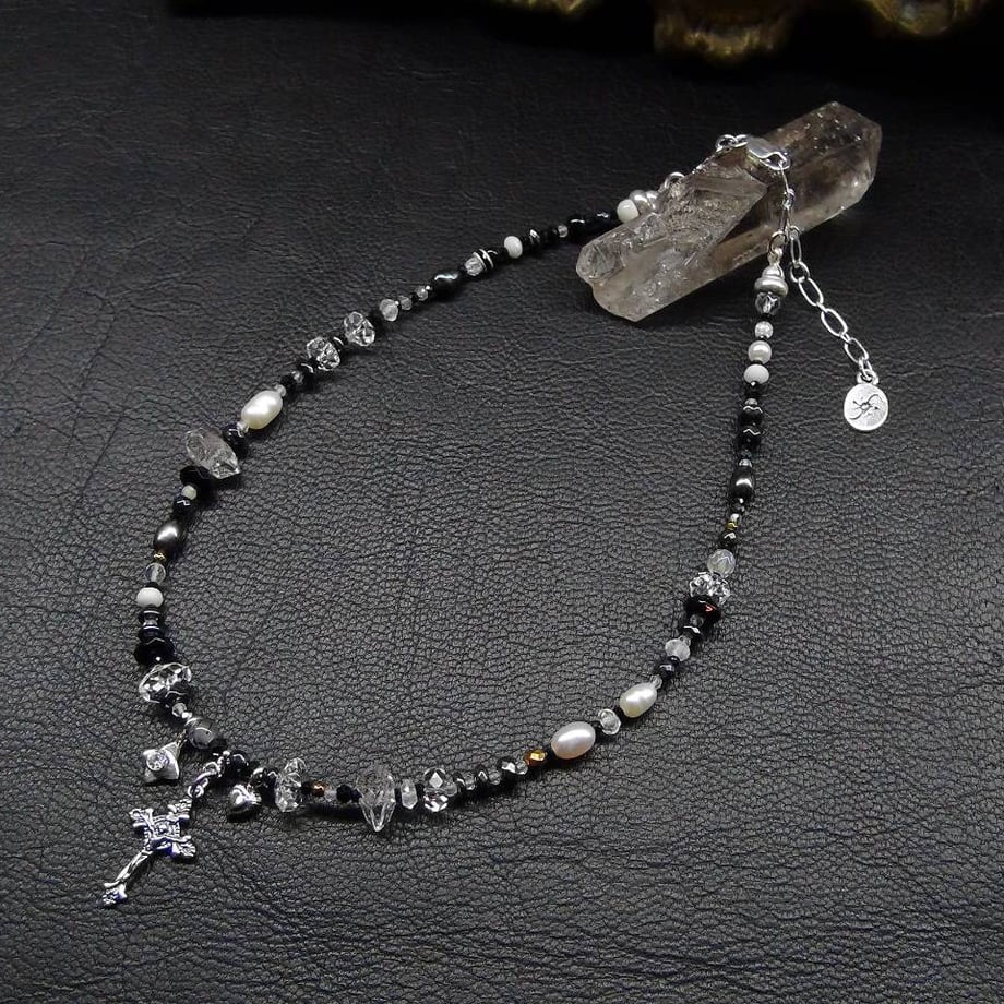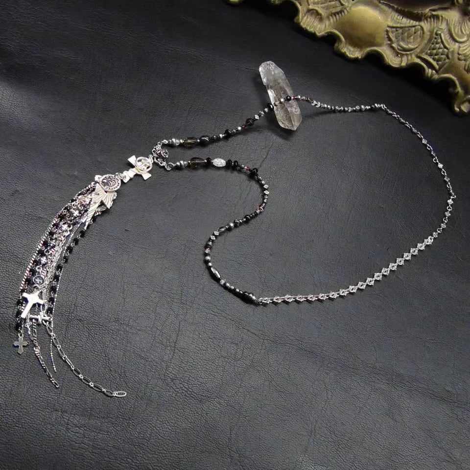 [Material] Stone: ヘマタイト - Hematite ホークスアイ - Hawks Eye スモーキークオーツ - Smoky Quartz オニキス - Onyx ブラックスピネル - Black Spinel 水晶 - Crystal クラック水晶 - Crack Crystal ガーネット - Garnet ロードライトガーネット - Rhodolite Garnet 装飾: シルバー925 - Silver925 真鍮純銀メッキ [Size] 全長/Overall length:58cm 円周/Circumference length:72cm ドロップ/Drop length:23cm